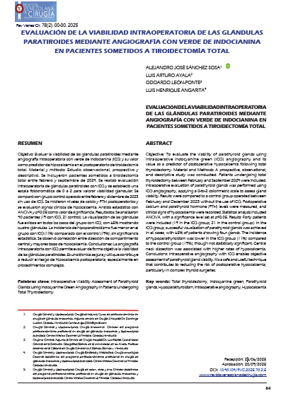 Objetivo: Evaluar la viabilidad de las glándulas paratiroides mediante angiografía intraoperatoria con verde de indocianina (ICG) y su valor como predictor de hipocalcemia en el postoperatorio de tiroidectomía total. Material y método: Estudio observacional, prospectivo y descriptivo. Se incluyeron pacientes sometidos a tiroidectomía total entre febrero y septiembre de 2024. Se realizó evaluación intraoperatoria de glándulas paratiroides con ICG y se estableció una escala fotocromática de 0 a 2 para valorar viabilidad glandular. Se comparó con grupo control operado entre febrero y diciembre de 2023 sin uso de ICG. Se midieron niveles de calcio y PTH postoperatorios y se evaluaron signos clínicos de hipocalcemia. Análisis estadístico con ANOVA y p<0,05 como valor de significancia. Resultados: Se analizaron 40 pacientes (19 con ICG, 21 control). La visualización de las glándulas fue exitosa en todos los casos del grupo con ICG, con 65% mostrando cuatro glándulas. La incidencia de hipoparatiroidismo fue menor en el grupo con ICG (11%) comparado con el control (19%), sin significancia estadística. Se observó correlación entre disección de compartimiento central y mayores tasas de hipocalcemia. Conclusiones: La angiografía intraoperatoria con ICG permite evaluar de forma objetiva la viabilidad de las glándulas paratiroides. Es una técnica segura y útil que contribuye a reducir el riesgo de hipocalcemia postoperatoria, especialmente en procedimientos complejos. Palabras clave:Tiroidectomía total, Verde de indocianina, Glándulas paratiroides, Hipoparatiroidismo, Angiografía intraoperatoria, Hipocalcemia