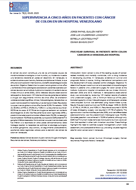 Introducción: El cáncer de colon representa un problema de salud pública creciente en países en vías de desarrollo. En Venezuela, la información sobre supervivencia y factores pronósticos es escasa. Objetivo: Determinar la supervivencia global a cinco años y los factores clínico-patológicos asociados en pacientes operados por cáncer de colon en el IAHULA entre 2005 y 2015. Métodos: Estudio observacional retrospectivo. Se revisaron 106 historias clínicas de pacientes sometidos a cirugía por cáncer de colon con seguimiento mínimo de cinco años. Se analizaron variables sociodemográficas, clínicas, histopatológicas y terapéuticas. Se calcularon curvas de Kaplan-Meier para estimar la supervivencia. Resultados: La supervivencia global a cinco años fue del 37,7%. Las tasas por estadio fueron: 100% (estadio 0), 83,3% (I), 57,9% (II), 39,3% (III) y 4,8% (IV). La recidiva ocurrió en el 38,4% de los casos. El 37,7% de las cirugías se realizaron en contexto de emergencia. La mayoría de los tumores se localizaron en el colon sigmoides (33%) y el tipo histológico predominante fue el adenocarcinoma bien diferenciado (45,3%). La resección fue completa en el 78,3% de los casos, pero solo el 8,5% tuvo ?12 ganglios resecados. Conclusiones: La supervivencia a cinco años fue inferior a la reportada en países latinoamericanos. El estudio aporta datos regionales relevantes y enfatiza la importancia del seguimiento postoperatorio y la optimización de los tratamientos quirúrgicos y adyuvantes.