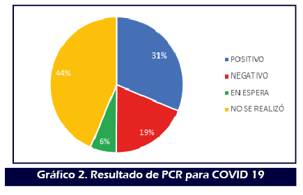 Del total de participantes se realizó toma de muestra de hisopado nasofaríngeo al 56,4% con resultado de la reacción en cadena de polimerasa positivo en el 31,3%, negativo en el 18,8% y el 6,3% en espera de resultados para el momento del estudio. (Gráfico 2)