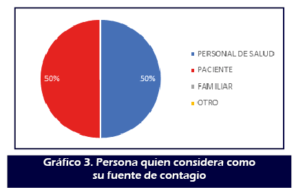 El 50% de la población estudiada aseguró que la fuente de su infección fue un paciente positivo para COVID-19 mientras que el otro el 50% refirió que la fuente fue contacto con personal de salud. (Gráfico 3)