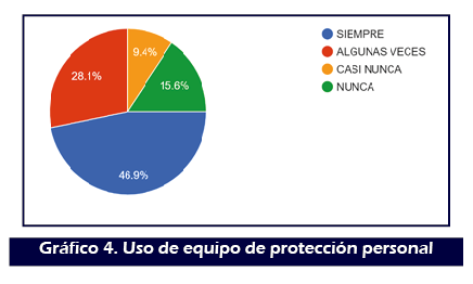 En lo que respecta a los métodos de protección, el 83,1% refirió conocer y aplicar el procedimiento para colocar y retirar el EPP. El 46,9% refirió usar siempre EPP, 28,1% algunas veces, 9,4% casi nunca y 15,6% nunca. (Gráfico 4)