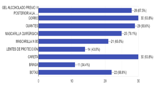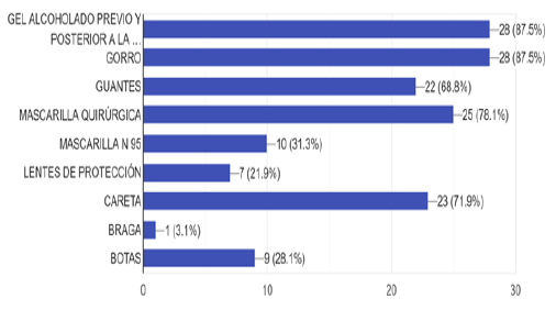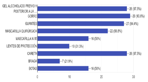 En los procedimientos generadores de aerosoles refirieron el uso de gel alcoholado 87,5%, gorro 93,8%, guantes 90,6%, mascarilla quirúrgica 78,1%, N95 65,5%, lentes de protección 43,8%, careta 93,8%, braga 34,4%, botas 68,8%. (Gráfico 5-c)