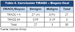 sistema TIRADS, resultado de biopsia extemporánea y con