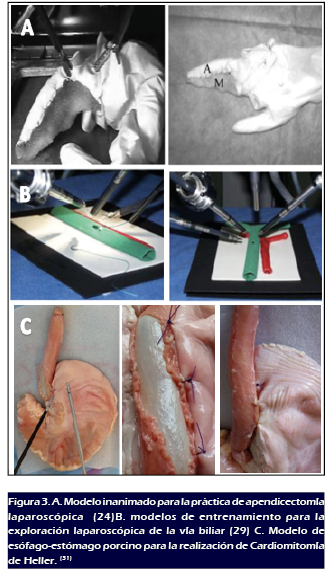 Figura 3A), (24,25) modelos de entrenamiento para la exploración laparoscópica de la vía biliar