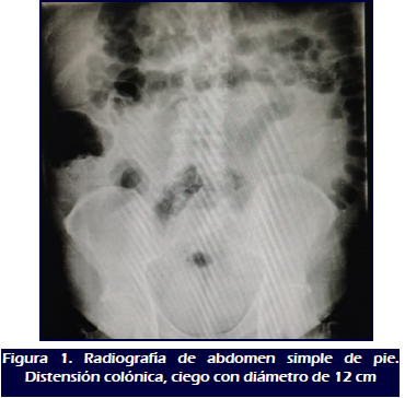 afebril, hemodinámicamente estable. Abdomen: distendido, ruidos