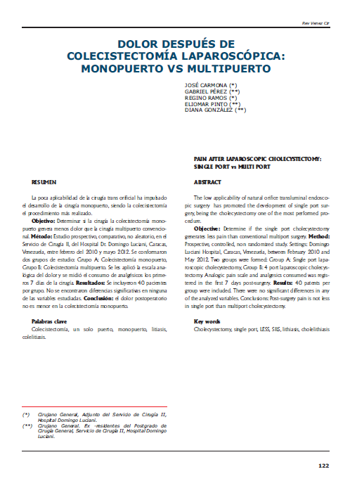 Objetivo: Determinar si la cirugía la colecistectomía monopuerto genera menos dolor que la cirugía multipuerto convencional. Método: Estudio prospectivo, comparativo, no aleatorio, en el Servicio de Cirugía II, del Hospital Dr. Domingo Luciani, Caracas, Venezuela, entre febrero del 2010 y mayo 2012. Se conformaron dos grupos de estudio: Grupo A: Colecistectomía monopuerto, Grupo B: Colecistectomía multipuerto. Se les aplicó la escala analógica del dolor y se midió el consumo de analgésicos los primeros 7 días de la cirugía. Resultados: Se incluyeron 40 pacientes por grupo. No se encontraron diferencias significativas en ninguna de las variables estudiadas. Conclusión: el dolor postoperatorio no es menor en la colecistectomía monopuerto.
