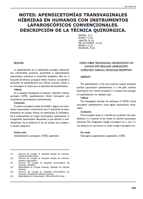 La apendicectomía es la intervención quirúrgica abdominal, más comúnmente practicada, actualmente la apendicectomía laparoscópica constituye la modalidad terapéutica ideal, en la búsqueda de técnicas quirúrgicas menos invasivas, se propone la realización de apendicectomía por orificios naturales, siendo la vía transvaginal el acceso para el desarrollo del procedimiento. Método: En la presente investigación se expone y describe la técnica quirúrgica NOTES: apendicectomía híbrida transvaginal con instrumentos laparoscópicos convencionales. Conclusión: El acceso transvaginal parece ser factible y seguro con instrumental laparoscópico convencional, para la realización de apendicectomías en cuadros clínicos no complicados. Es indispensable el entrenamiento en cirugía laparoscópica convencional. La triangulación laparoscópica desaparece, lo que dificulta la maniobrabilidad. No es necesario el uso de trócares para acceder a la cavidad abdominal.