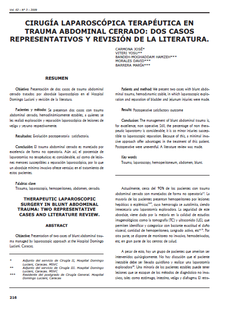 Carmona , J., Viteri , Y., Bandeh-Moghaddam, H., Morales , D., & Barrera , M. (2020). Cirugía laparoscópica terapéutica en trauma abdominal cerrado: dos casos representativos y revisión de la literatura. REVISTA VENEZOLANA DE CIRUGÍA, 62(3), 216–221. Recuperado a partir de https://revistavenezolanadecirugia.com/index.php/revista/article/view/211 (Original work published 28 de marzo de 2020)