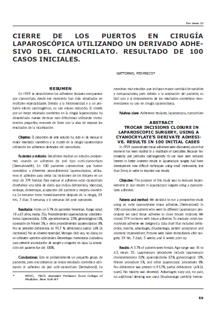 sometidos a diferentes procedimientos laparoscópicos, utilizamos el adhesivo para cerrar las incisiones de los trócares en un total de 374 heridas. Para evaluar el adhesivo octal-cianocrilato diseñamos una tabla de datos que incluía dehiscencia, toxicidad, ventajas, desventajas, aceptación del paciente y mejoría cosmética. Se tomaron fotos inmediatamente después de la cirugía, 24 hrs.; 7 días; 3 semanas, y 6 semanas del post operatorio. Resultados: Hubo un 57% de pacientes femeninas. Rango edad: 18 a 63 años, media: 35a. Procedimientos laparoscópicos: colecistectomía laparoscópica: 52%; apendicectomía: 23%; ginecológicos:12%, operación de Nissen 5%, y otros procedimientos laparoscópicos 8%. No se presentó dehiscencia en 95.7 %; dehiscencia parcial 1,6% (6 incisiones). No se observó toxicidad. Ventajas: fácil uso, no dolor, no