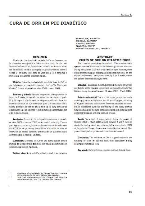 El principio dominante del método de Orr es favorecer con la inmovilización rigurosa la defensa tisular contra la infección. Durante la Guerra Civil Española era utilizado en fracturas abiertas, se realizaba limpieza quirúrgica, se aplicaba vaselina sobre la herida y se cubría con bota de yeso por 2 o 3 semanas, a menos que el paciente presentara fiebre. Objetivo: Evaluar la efectividad del uso de la “cura de Orr” en pie diabético en el Hospital Universitario de Coro “Dr. Alfredo Van Grieken”, durante el período octubre 2008 - marzo 2009. Pacientes y método: Estudio prospectivo, descriptivo en un lapso de 6 meses, incluyendo pacientes con pie diabético grado III y IV según la clasificación de Wagner modificada. Se evalúa número de curas de Orr necesarias para la cicatrización de la úlcera, intervalo de tiempo del cambio de la cura, período de cicatrización de las lesiones y complicaciones presentadas con este método de cura. Resultados: A un total de siete pacientes durante el período octubre 2008 – marzo 2009, se les realizó entre 4 y 7 curas para lograr cicatrización, la cual se obtuvo antes de los 06 meses en 100% de los pacientes; realizándose el cambio de cura en intervalos de tiempo variables, presentando un paciente atopia