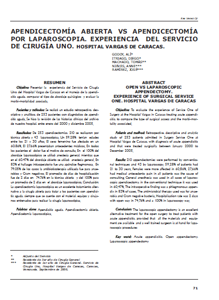 Objetivo: Presentar la experiencia del Servicio de Cirugía Uno del Hospital Vargas de Caracas en el manejo de la apendicitis aguda, comparar el tipo de abordaje quirúrgico y evaluar la morbi-mortalidad asociada. Pacientes y métodos: Se realizó un estudio retrospectivo, descriptivo y analítico, de 253 pacientes con diagnóstico de apendicitis aguda. Se hizo la revisión de las historias clínicas del archivo de nuestro hospital, entre enero del 2000 y diciembre 2005. Resultados: De 253 apendicectomías, 210 se realizaron por técnica abierta y 43 laparoscópica. Un 59,28% tenían edades entre los 21 y 30 años. El sexo femenino fue afectado en un 60,86%. El 27,66% presentaban antecedentes médicos. En todos los pacientes el dolor fue el motivo de consulta. En el 100% del abordaje laparoscópico se utilizó anestesia general, mientras que en el 60,47% del abordaje abierto se utilizó anestesia general. En 83% el hallazgo intraoperatorio fue una apéndice flegmonosa. En 79,05% de los casos la antibioticoterapia utilizada fue para anaerobios y Gram negativos. El promedio de días de hospitalización fue de 2 días en 74,76% en la técnica abierta y del 100% para un promedio de 2 días en el abordaje laparoscópico. Conclusión: La apendicectomía laparoscópica es un excelente tratamiento alternativo a la cirugía abierta para tratar a los pacientes con apendicitis aguda, siempre que se cuente con el material, equipo y cirujanos entrenados para realizar la cirugía laparoscópica.