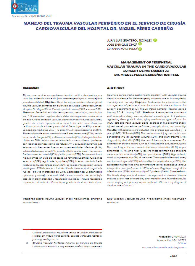 Resumen El trauma se considera un problema de salud publico, siendo el trauma vascular un desafío para el cirujano de emergencia por su complejidad y morbimortalidad.ObjetivoDescribir la experiencia en el manejo del trauma vascular periférico en el servicio de cirugía cardiovascular del Hospital Dr. Miguel Pérez Carreño periodo Enero 2.018 – Enero 2.021.MetodosSe realizo estudio prospectivo, descriptivo y transversal. Constituido por 410 pacientes, registrándose datos demográficos, mecanismo de lesión, signos blandos y duros vasculares, grados de shock hipovolémico, vaso lesionado, procedimiento realizado, complicaciones y mortalidad.Resultados Se incluyeron 410 paciente. La edad fue promedio 25,6 ± 18 años (14-72). Sexo masculino en (89%). El mecanismo de lesión predominante fue el penetrante (92%), por herida de arma de fuego (68%) y (7%) el trauma cerrado. El diagnostico fue clínico en el (90%), sitio de lesión mas afectado las extremidades inferiores (81%), Extremidades superiores (17%) y Cuello (2)%, el tipo de lesión mas común transeccion arterial en (49%) y lesión parcial en un (20%), Shock hipovolémico en (60%), la arterial femoral superficial siendo la mas lesionada en (70%) seguida de la poplítea (20%). Procedimiento realizado interposición venosa autologa (89%). La infección de sitio operatorio en (15%) y Mortalidad de (0.4%).Conclusiones El diagnostico oportuno y manejo adecuado del trauma vascular sin duda alguna se demostró una la baja tasa de morbimortalidad y resultados favorables, incluso realizando reparacion primaria en el 100% de los casos sin diferir alguno por grado de shock ni uso de shunt.