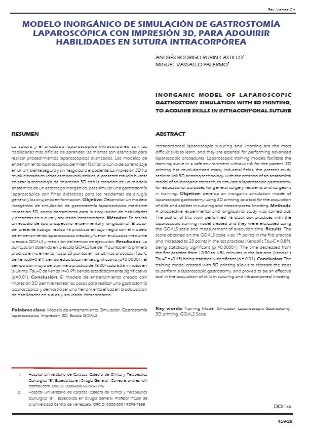 La sutura y el anudado laparoscópico intracorpóreo son las habilidades más difíciles de aprender, las mismas son esenciales para realizar procedimientos laparoscópicos avanzados. Los modelos de entrenamiento laparoscópico permiten facilitar la curva de aprendizaje en un ambiente seguro y sin riesgo para el paciente. La impresión 3D ha revolucionado muchos campos industriales, el presente estudio buscar enlazar la tecnología de impresión 3D con la creación de un modelo anatómico de un estómago inorgánico, para simular una gastrostomía laparoscópica con fines didácticos para los residentes de cirugía general y los cirujanos en formación. Objetivo: Desarrollar un modelo inorgánico de simulación de gastrostomía laparoscópica mediante impresión 3D, como herramienta para la adquisición de habilidades y destrezas en sutura y anudado intracorpóreo. Métodos: Se realizó un estudio de tipo prospectivo, experimental y longitudinal. El autor del presente trabajo, realizó 16 prácticas en caja negra con el modelo de entrenamiento laparoscópico creado y fueron evaluadas mediante la escala GOALS y medición del tiempo de ejecución. Resultados: La puntuación obtenida en la escala GOALS fue de 19 puntos en la primera práctica e incrementó hasta 23 puntos en las últimas prácticas (Tau-C de Kendall=0,89) siendo estadísticamente significativo (p<0,00001). El tiempo disminuyó de la primera practica de 18:30 hasta 6:56 minutos en la última (Tau-C de Kendall=-0,49) siendo estadísticamente significativo (p=0,01). Conclusión: El modelo de entrenamiento creado con impresión 3D permite recrear los pasos para realizar una gastrostomía laparoscópica, y demostró ser una herramienta eficaz en la adquisición de habilidades en sutura y anudado intracorpóreo.