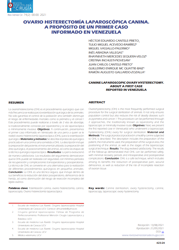 La ovariohisterectomia (OH) es el procedimiento quirúrgico que con más frecuencia se realiza para la esterilización quirúrgica de los animales. No solo garantiza el control de la población sino también disminuye el riesgo de enfermedades mortales como la piómetra y el cáncer.1 Este procedimiento puede realizarse a través de 2 vías de abordaje, la tradicionalmente conocida por laparotomía y la vía laparoscópica o mínimamente invasiva. Objetivos: A continuación, presentamos el primer caso informado en Venezuela de una perra a quien se le realizó ovario histerectomía laparoscópica (OHL) para la esterilización quirúrgica. Materiales y métodos: Se describe el protocolo quirúrgico practicado en una canina sana sometida a OHL. La descripción incluye la preparación del paciente, el instrumental utilizado, la preparación del área quirúrgica, el posicionamiento del animal, así como las etapas de la técnica quirúrgica laparoscópica. Resultados: La perra evolucionó de manera satisfactoria. Los resultados del seguimiento demostraron que la OHL puede ser realizada con seguridad, con mínimos períodos de recuperación y complicaciones transoperatorias y posoperatorias. La técnica de OHL se convierte en una alternativa para la realización de diferentes procedimientos quirúrgicos en pequeños animales. Conclusión: La OHL es una técnica segura, que incluye dentro de sus beneficios la reducción del dolor posoperatorio, dehiscencia de la herida, así como disminución del riesgo de resección incompleta del tejido ovárico.