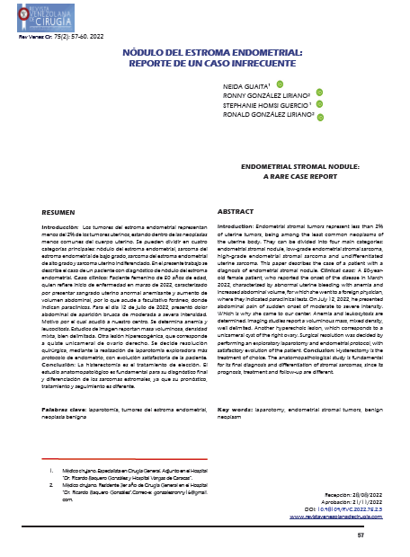 Introducción: Los tumores del estroma endometrial representan menos del 2% de los tumores uterinos, se encuentran dentro de las neoplasias menos comunes del cuerpo uterino. Se pueden dividir en cuatro categorías principales: nódulo del estroma endometrial, sarcoma del estroma de endometrio de bajo grado, sarcoma del estroma endometrial de alto grado y sarcoma uterino indiferenciado. En el presente trabajo se describe el caso de un paciente con diagnóstico de nódulo del estroma endometrial. Caso clínico: Paciente femenino de 50 años de edad, quien refiere inicio de enfermedad en marzo del 2022, caracterizado por presentar sangrado uterino anormal anemizante y aumento de volumen abdominal, por lo que acude a facultativo foraneo, donde indican paraclínicos. Para el día 12 de julio del 2022, presentó dolor abdominal de aparición brusca de moderada a severa intensidad. Motivo por el cual acudió a nuestro centro. Se determina anemia y leucocitosis. Estudios de imagen reportan masa voluminosa, densidad mixta, bien delimitada. Otra lesión hiperecogénica, que corresponde a quiste unicameral de ovario derecho. Se decide resolución quirúrgica, mediante la realización de laparotomía exploradora + protocolo de endometrio, con evolución satisfactoria de la paciente. Conclusión: La histerectomía es el tratamiento de elección. El estudio anatomopatológico es fundamental para su diagnóstico final y diferenciación de los sarcomas estromales, ya que su pronóstico, tratamiento y seguimiento es diferente.