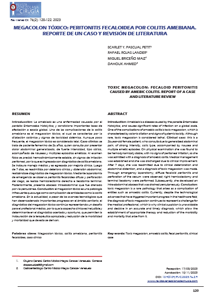 Pascual, S., Rojas Lander, R. ., Briceño Maiz, M. ., & Ahmed, D. . (2023). Megacolon tóxico: peritonitis fecaloidea por colitis amebiana. Reporte de un caso y revisión de literatura. REVISTA VENEZOLANA DE CIRUGÍA, 76(2). https://doi.org/10.48104/RVC.2023.76.2.9