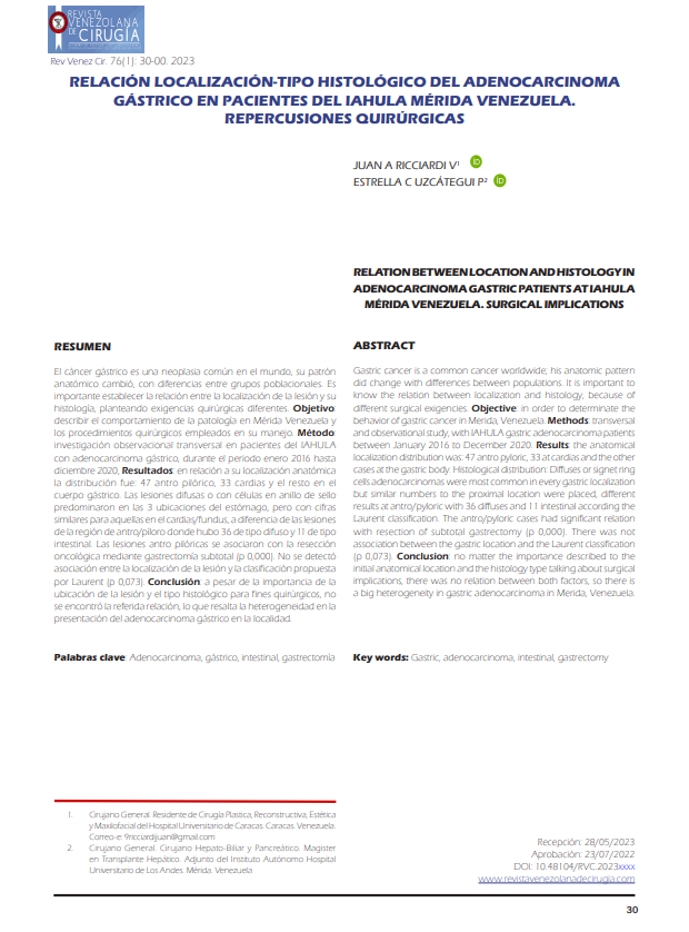 El cáncer gástrico es una neoplasia común en el mundo, su patrón anatómico cambió, con diferencias entre grupos poblacionales. Es importante establecer la relación entre la localización de la lesión y su histología, planteando exigencias quirúrgicas diferentes. Objetivo: describir el comportamiento de la patología en Mérida Venezuela y los procedimientos quirúrgicos empleados en su manejo. Método: investigación observacional transversal en pacientes del IAHULA con adenocarcinoma gástrico, durante el periodo enero 2016 hasta diciembre 2020, Resultados: en relación a su localización anatómica la distribución fue: 47 antro pilórico, 33 cardias y el resto en el cuerpo gástrico. Las lesiones difusas o con células en anillo de sello predominaron en las 3 ubicaciones del estómago, pero con cifras similares para aquellas en el cardias/fundus, a diferencia de las lesiones de la región de antro/píloro donde hubo 36 de tipo difuso y 11 de tipo intestinal. Las lesiones antro pilóricas se asociaron con la resección oncológica mediante gastrectomía subtotal (p 0,000). No se detectó asociación entre la localización de la lesión y la clasificación propuesta por Laurent (p 0,073). Conclusión: a pesar de la importancia de la ubicación de la lesión y el tipo histológico para fines quirúrgicos, no se encontró la referida relación, lo que resalta la heterogeneidad en la presentación del adenocarcinoma gástrico en la localidad.
