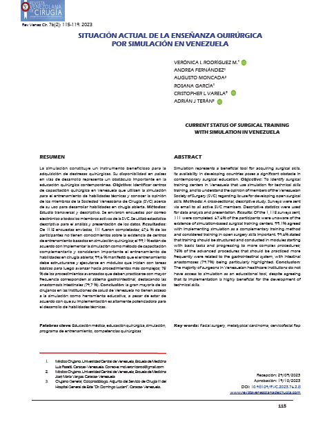Rodríguez M, V. I., Fernández, A. ., Moncada, A. ., García, R. ., Varela, C. L. ., & Terán, A. J. . (2023). Situación actual de la enseñanza quirúrgica por simulación en Venezuela. REVISTA VENEZOLANA DE CIRUGÍA, 76(2). https://doi.org/10.48104/RVC.2023.76.2.8
