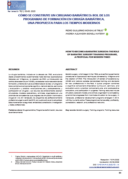 Monsalve Trejo, P., & Bonelli Natera, A. A. . (2025). Cómo se construye un cirujano bariátrico: Rol de los programas de formación en cirugía bariátrica, una propuesta para los tiempos modernos. REVISTA VENEZOLANA DE CIRUGÍA, 78(1). https://doi.org/10.48104/RVC.2025.78.1.13