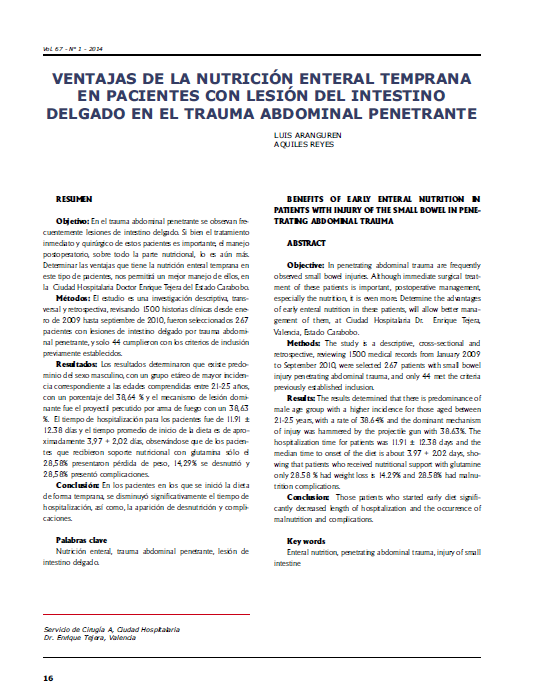 Objetivo: En el trauma abdominal penetrante se observan frecuentemente lesiones de intestino delgado. Si bien el tratamiento inmediato y quirúrgico de estos pacientes es importante, el manejo postoperatorio, sobre todo la parte nutricional, lo es aún más. Determinar las ventajas que tiene la nutrición enteral temprana en este tipo de pacientes, nos permitirá un mejor manejo de ellos, en la Ciudad Hospitalaria Doctor Enrique Tejera del Estado Carabobo. Métodos: El estudio es una investigación descriptiva, transversal y retrospectiva, revisando 1500 historias clínicas desde enero de 2009 hasta septiembre de 2010, fueron seleccionados 267 pacientes con lesiones de intestino delgado por trauma abdominal penetrante, y solo 44 cumplieron con los criterios de inclusión previamente establecidos. Resultados: Los resultados determinaron que existe predominio del sexo masculino, con un grupo etáreo de mayor incidencia correspondiente a las edades comprendidas entre 21-25 años, con un porcentaje del 38,64 % y el mecanismo de lesión dominante fue el proyectil percutido por arma de fuego con un 38,63%. El tiempo de hospitalización para los pacientes fue de 11.91 ± 12.38 días y el tiempo promedio de inicio de la dieta es de aproximadamente 3,97 + 2,02 días, observándose que de los pacientes que recibieron soporte nutricional con glutamina sólo el 28,58% presentaron pérdida de peso, 14,29% se desnutrió y 28,58% presentó complicaciones. Conclusión: En los pacientes en los que se inició la dieta de forma temprana, se disminuyó significativamente el tiempo de hospitalización, así como, la aparición de desnutrición y complicaciones.