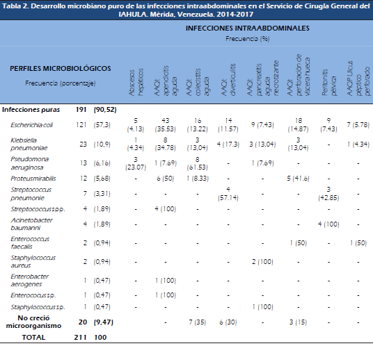 Los principales patógenos aislados de las muestras intraabdominales son enterobacterias, Escherichia coli y Klebsiella pneumoniae son las más frecuentemente aisladas. Le siguen en importancia los cocos positivos y los patógenos anaerobios. (3)