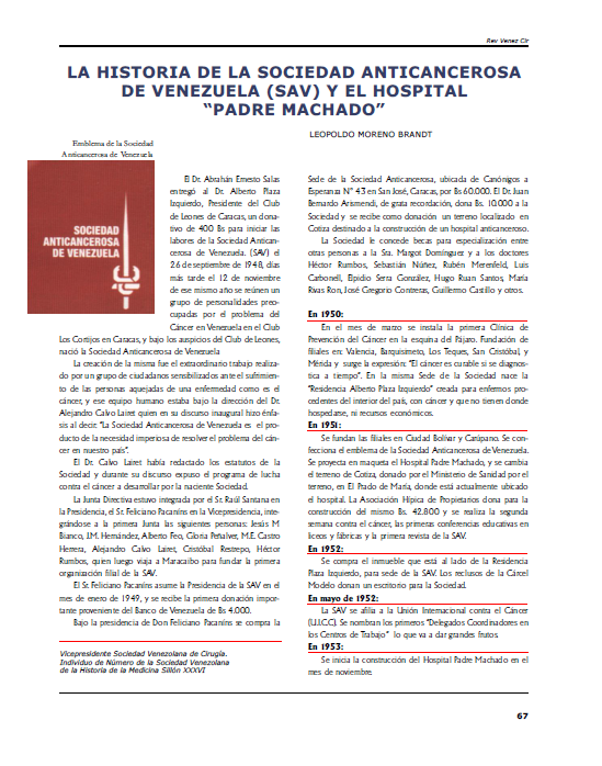 Moreno Brandt, L. . (2020). La historia de la sociedad anticancerosa de venezuela (sav) y el Hospital “Padre Machado”. REVISTA VENEZOLANA DE CIRUGÍA, 67(2), 67–75. Recuperado a partir de https://www.revistavenezolanadecirugia.com/index.php/revista/article/view/110 (Original work published 12 de marzo de 2020)