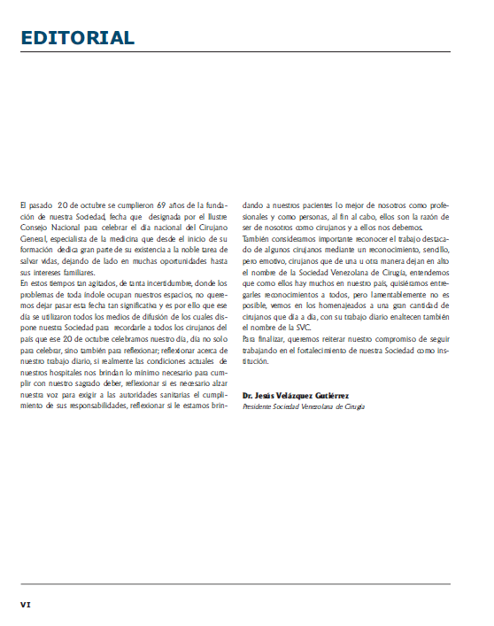 - Jesús Velázquez Gutiérrez, Editorial , REVISTA VENEZOLANA DE CIRUGÍA : Vol. 63 Núm. 1 (2010)
