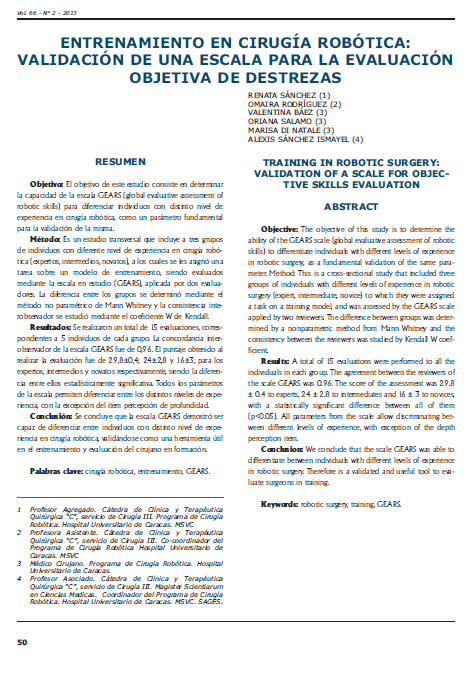 de la escala permiten diferenciar entre los distintos niveles de experiencia, con la excepción del ítem percepción de profundidad. Conclusión: Se concluye que la escala GEARS demostró ser capaz de diferenciar entre individuos con distinto nivel de experiencia en cirugía robótica, validándose como una herramienta útil en el entrenamiento y evaluación del cirujano en formación.