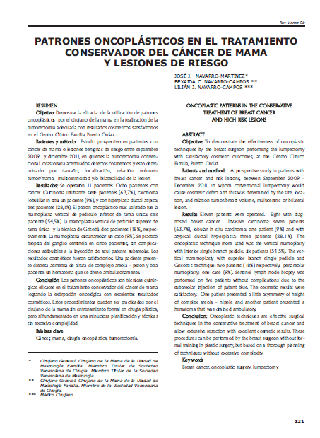Objetivo: Demostrar la eficacia de la utilización de patrones oncoplásticos por el cirujano de la mama en la realización de la tumorectomía adecuada con resultados cosméticos satisfactorios en el Centro Clínico Familia, Puerto Ordaz. Pacientes y método: Estudio prospectivo en pacientes con cáncer de mama o lesiones benignas de riesgo entre septiembre 2009 y diciembre 2011, en quienes la tumorectomía convencional ocasionaría acentuados defectos cosméticos y ésto determinado por tamaño, localización, relación volumen tumor/mama, multicentricidad y/o bilateralidad de la lesión. Resultados: Se operaron 11 pacientes. Ocho pacientes con cáncer. Carcinoma infiltrante: siete pacientes (63,7%), carcinoma lobulillar in situ: un paciente (9%), y con hiperplasia ductal atípica: tres pacientes (28,1%). El patrón oncoplástico más utilizado fue la mamoplastia vertical de pedículo inferior de rama única: seis paciente (54,5%). La mamoplastia vertical de pedículo superior de rama única y la técnica de Grisotti: dos pacientes (18%), respectivamente. La mamoplastia circunareolar un caso (9%). Se practicó biopsia del ganglio centinela en cinco pacientes, sin complicaciones atribuibles a la inyección de azul patente subareolar. Los