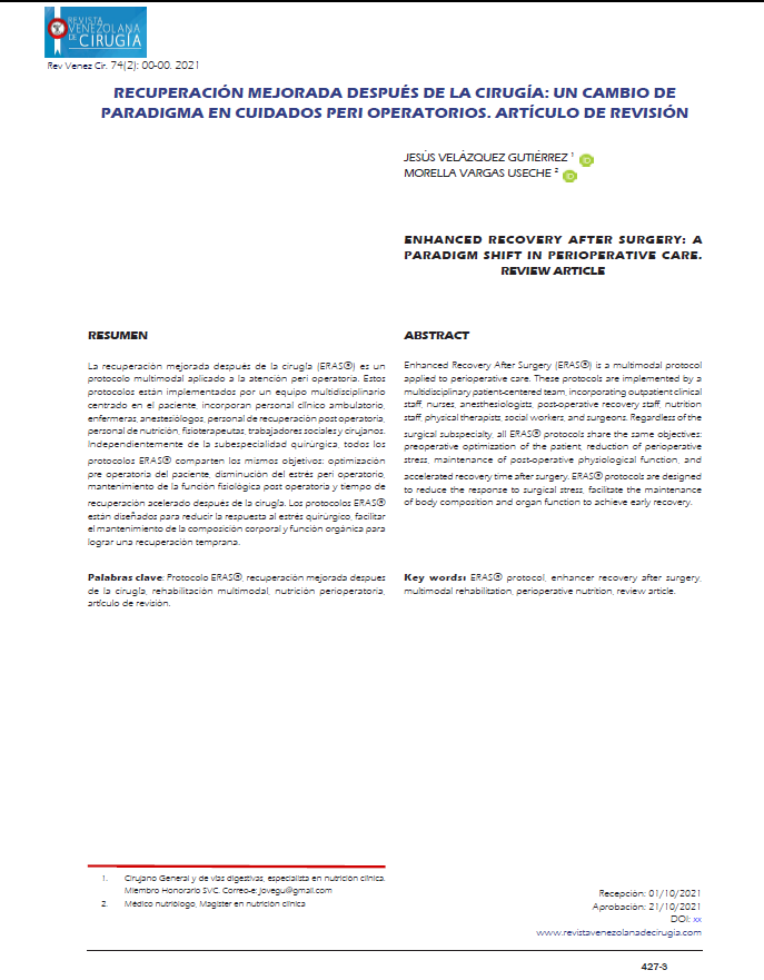 Velázquez Gutiérrez, J., & Vargas Useche , M. . (2021). Recuperación mejorada después de la cirugía: un cambio de paradigma en cuidados peri operatorios. Artículo de revisión. REVISTA VENEZOLANA DE CIRUGÍA, 74(2). https://doi.org/10.48104/RVC.2021.74.2.7