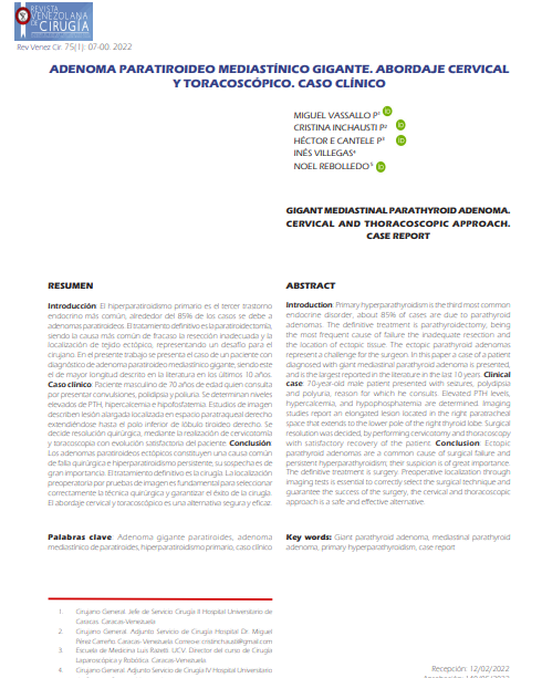 Introducción: El hiperparatiroidismo primario es el tercer trastorno endocrino más común, alrededor del 85% de los casos se debe a adenomas paratiroideos. El tratamiento definitivo es la paratiroidectomía, siendo la causa más común de fracaso la resección inadecuada y la localización de tejido ectópico, representando un desafío para el cirujano. En el presente trabajo se presenta el caso de un paciente con diagnóstico de adenoma paratiroideo mediastínico gigante, siendo este el de mayor longitud descrito en la literatura en los últimos 10 años. Caso clínico: Paciente masculino de 70 años de edad quien consulta por presentar convulsiones, polidipsia y poliuria. Se determinan niveles elevados de PTH, hipercalcemia e hipofosfatemia. Estudios de imagen describen lesión alargada localizada en espacio paratraqueal derecho extendiéndose hasta el polo inferior de lóbulo tiroideo derecho. Se decide resolución quirúrgica, mediante la realización de cervicotomía y toracoscopia con evolución satisfactoria del paciente. Conclusión: Los adenomas paratiroideos ectópicos constituyen una causa común de falla quirúrgica e hiperparatiroidismo persistente, su sospecha es de gran importancia. El tratamiento definitivo es la cirugía. La localización preoperatoria por pruebas de imagen es fundamental para seleccionar correctamente la técnica quirúrgica y garantizar el éxito de la cirugía. El abordaje cervical y toracoscópico es una alternativa segura y eficaz.