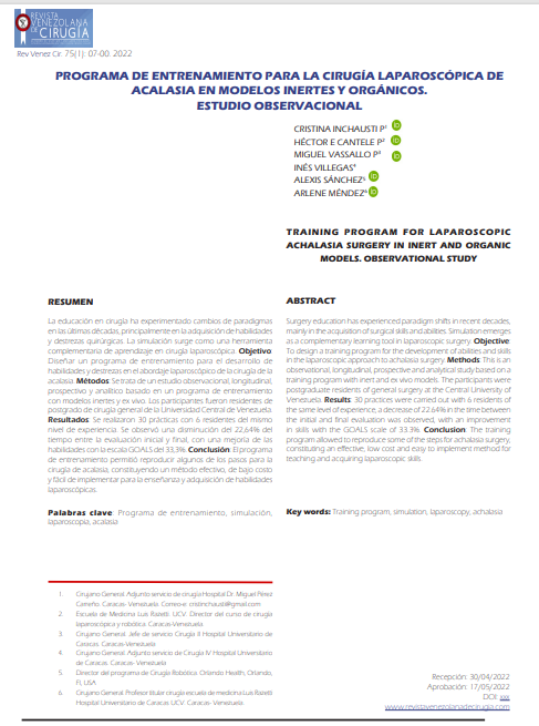 La educación en cirugía ha experimentado cambios de paradigmas en las últimas décadas, principalmente en la adquisición de habilidades y destrezas quirúrgicas. La simulación surge como una herramienta complementaria de aprendizaje en cirugía laparoscópica. Objetivo: Diseñar un programa de entrenamiento para el desarrollo de habilidades y destrezas en el abordaje laparoscópico de la cirugía de la acalasia. Métodos: Se trata de un estudio observacional, longitudinal, prospectivo y analítico basado en un programa de entrenamiento con modelos inertes y ex vivo. Los participantes fueron residentes de postgrado de cirugía general de la Universidad Central de Venezuela. Resultados: Se realizaron 30 prácticas con 6 residentes del mismo nivel de experiencia. Se observó una disminución del 22,64% del tiempo entre la evaluación inicial y final, con una mejoría de las habilidades con la escala GOALS del 33,3%. Conclusión: El programa de entrenamiento permitió reproducir algunos de los pasos para la cirugía de acalasia, constituyendo un método efectivo, de bajo costo y fácil de implementar para la enseñanza y adquisición de habilidades laparoscópicas.