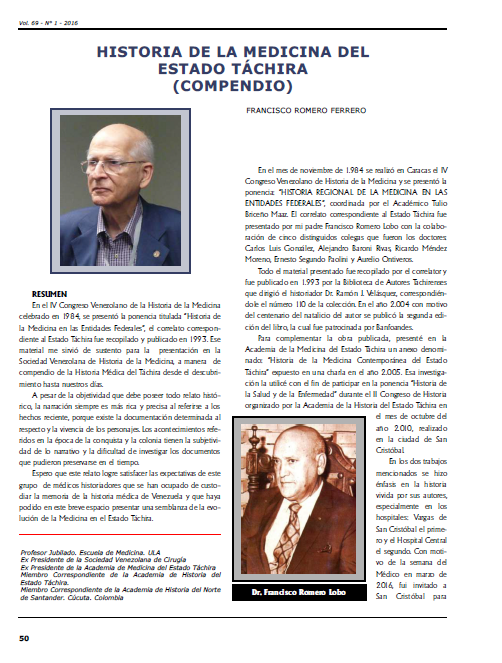En el IV Congreso Venezolano de la Historia de la Medicina celebrado en 1984, se presento? la ponencia titulada “Historia de la Medicina en las Entidades Federales”, el correlato correspondiente al Estado Ta?chira fue recopilado y publicado en 1993. Ese material me sirvio? de sustento para la presentacio?n en la Sociedad Venezolana de Historia de la Medicina, a manera de compendio de la Historia Me?dica del Ta?chira desde el descubrimiento hasta nuestros di?as.