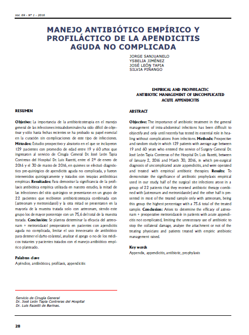 Objective: The importance of antibiotic treatment in the general management of intra-abdominal infections has been difficult to objectify and only until recently has tested its essential role in hea- ling without complications from infections. Methods: Prospective and random study in which 129 patients with average age between 19 and 60 years who entered the service of Surgery General Dr. Jose? Leo?n Tapia Contreras of the Hospital Dr. Luis Razetti, between of January 2, 2016 and March 30, 2016, in which pre-surgical diagnosis of uncomplicated acute appendicitis, and were operated and treated with empirical antibiotic therapies. Results: To demonstrate the significance of antibiotic prophylaxis empirical used in our study, half of the surgical site infections arose in a group of 22 patients that they received antibiotic therapy combi- ned with (aztreonam and metronidazole) and the other half is pre- sented in most of the treated sample only with aztreonam, being this group the highest percentage with a 75.6 total of the treated sample. Conclusion: Arises to determine the efficacy of aztreo- nam + preoperative metronidazole in patients with acute appendi- citis not complicated, limiting the unnecessary use of antibiotic to stop the collateral damage, analyze the attachment or not of the treating physicians and patients treated with empiric antibiotic management raised.